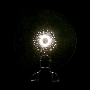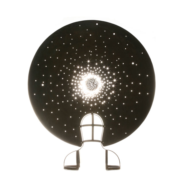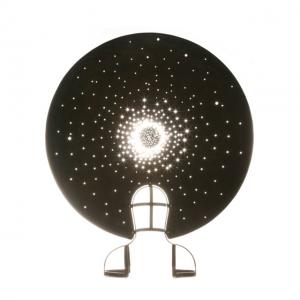 "Aureola no.1" is a black steel headpiece topped with a large circular plate which has hundreds of holes drilled on it in a radiated pattern. Lights could just come out from the holes as the steel piece is placed in front of the light. It generates a glimmering pattern which looks like a halo of the saint in classical religious paintings.