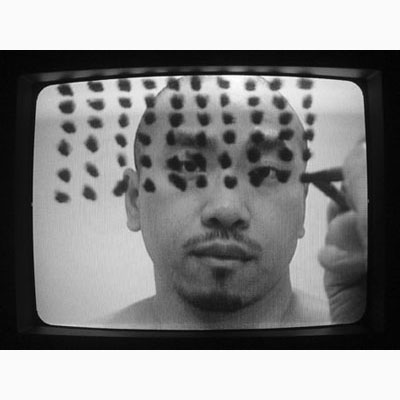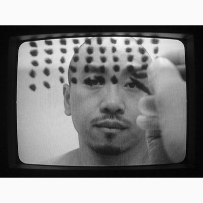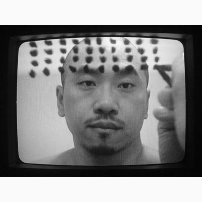 “Counting from 1 to 100” is a video installation work. The video image depicts a close-up of my head which is reflected in a mirror (self-reflection). It shows the process of me counting from 1 to 100 and drawing dots regularly with ink using a Chinese brush. I then wipe out the dots with my finger. In the first round of counting, the ink dots are lined from left to right and from top to bottom. There are 10 rolls, each with 10 dots. Finally, the 100 dots cover my entire face. In the second round of counting, I wipe away the dots with my finger, starting from the last one I have drawn. When I recite “1” , what can actually be seen on the mirror image is that “99” dots are left. When I count to 100, what can be seen is “0”. I deliberately cause the sound and image of the numeral concept to mismatch so as to break the inertia of perception. However, this “0” is not equivalent to “nothing” in the beginning because even though I try to wipe off the dots, traces of the dots can still be seen. My face remains covered by mottled ink.